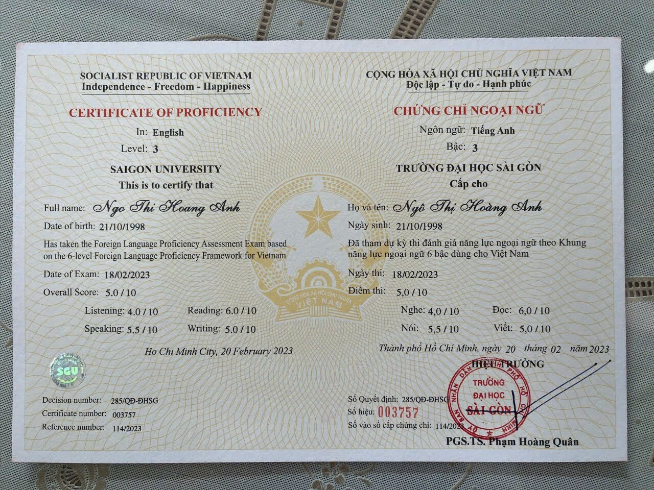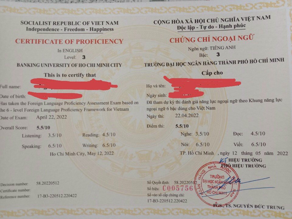 | Trung cấp | Bậc 3 | Có thể hiểu được các ý chính của một đoạn văn hay bài phát biểu chuẩn mực, rõ ràng về các chủ đề quen thuộc trong công việc, trường học, giải trí, v.v… Có thể xử lý hầu hết các tình huống xảy ra khi đến khu vực có sử dụng ngôn ngữ đó. Có thể viết đoạn văn đơn giản liên quan đến các chủ đề quen thuộc hoặc cá nhân quan tâm. Có thể mô tả được những kinh nghiệm, sự kiện, giấc mơ, hy vọng, hoài bão và có thể trình bày ngắn gọn các lý do, giải thích ý kiến và kế hoạch của mình. |